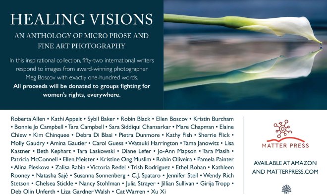 I’m floored to be included in Healing Visions, an anthology of 100 word stories inspired by the prompt of “healing visions” and paired with a Meg Boscov photograph, from Matter Press! The pages are filled with stories from flash luminiaries! And all proceeds will be donated to groups fighting for women’s rights everywhere. Pre-order here!